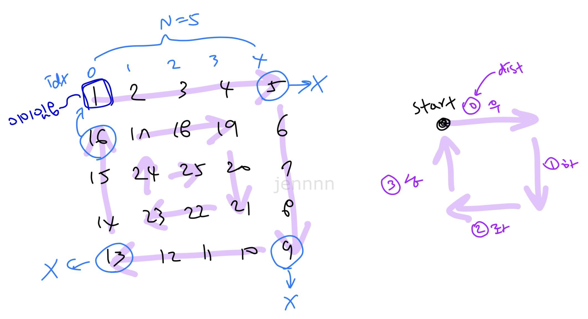 ์๋ ๊ทธ๋ฆผ์ฒ๋ผ N = 5. ์ฆ, 5 x 5 ๋ฐฐ์ด์ ์๊ฐํด๋ณด์.