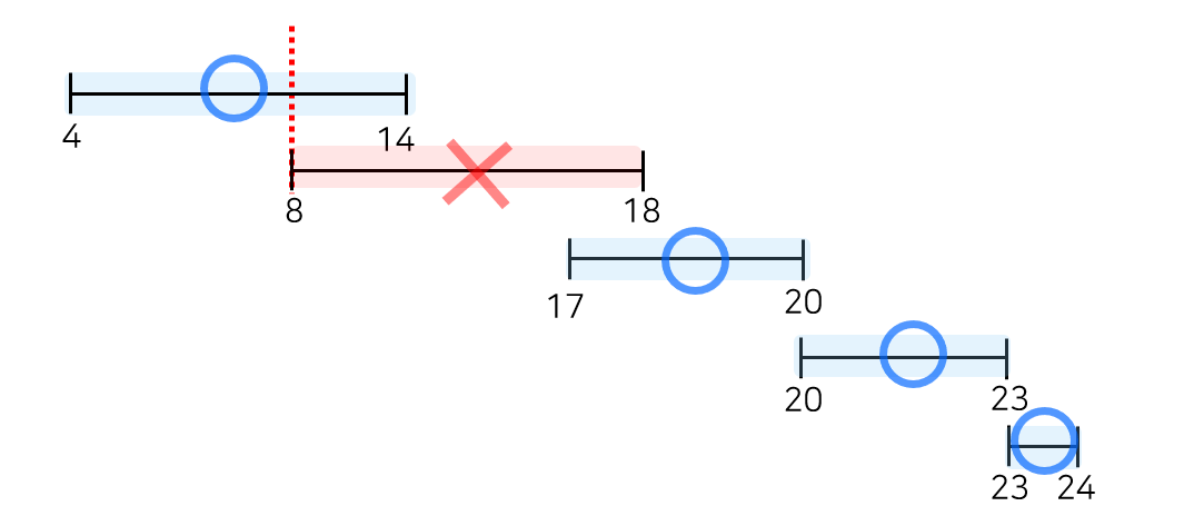 8์ฒ๋ผ ํ์ฌ ์์์๊ฐ์ด ์ ํ์ฐจ์ ์ข ๋ฃ์๊ฐ(14)๋ณด๋ค ์์ผ๋ฉด(๊ฒน์น๋ฉด) ์นด์ดํ ํ์ง ์๊ณ ,