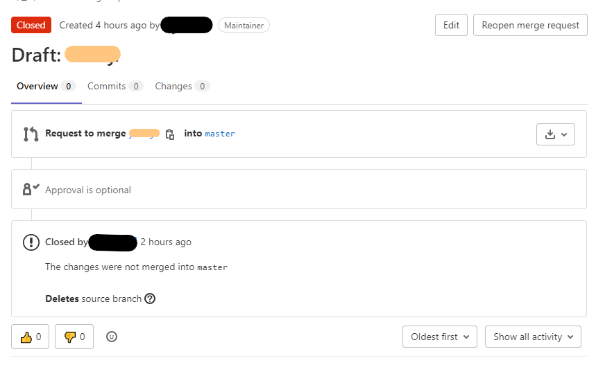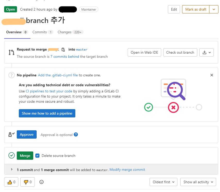 나는 closed로 머지를 닫고 test파일을 하나 추가해줘서 merge를 완료할 수 있었다.
