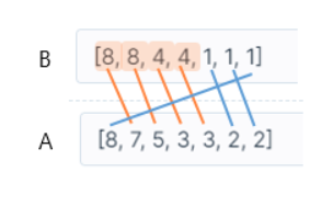 B๊ฐ A๋ณด๋ค ์ปค์ผํ๋๊น A,B ๋ ๋ค ๋ด๋ฆผ์ฐจ์์ผ๋ก ์ํ ํ ๋ค, B ๋ฆฌ์คํธ๋ฅผ ์ํํ๋ฉฐ A๋ณด๋ค ๊ฐ์ด ํด ๋๋ง answer์ ์นด์ดํ ํด์ฃผ๊ณ ์ธ๋ฑ์ค๋ฅผ ๋๋ ธ๋ค. (์ฃผํฉ)
